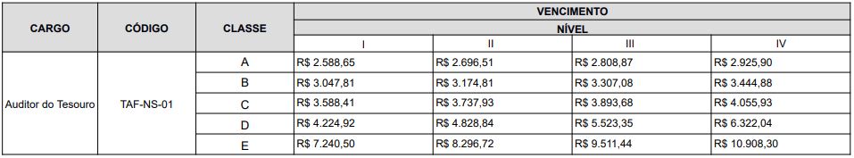 O vencimento básico para Auditor do Tesouro é de R$ R$ 2.469,38. Junto a esse valor, os servidores ainda recebem prêmios de produtividade e auxílios: