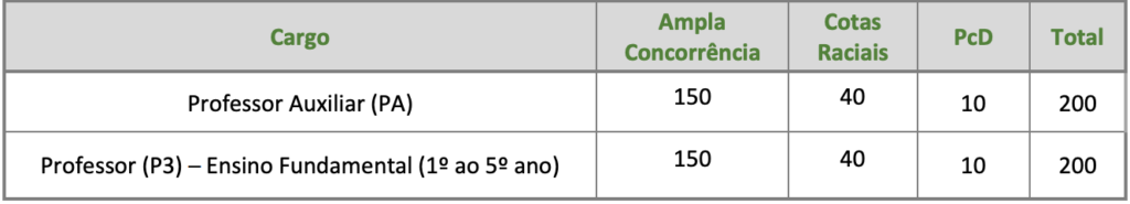 As vagas são para os cargos de auxiliar de serviço escolar, de nível médio, e professor (auxiliar e de ensino fundamental), de nível superior.