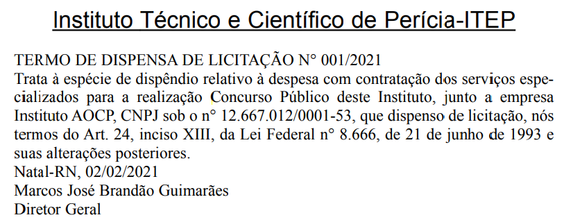 A autorização era a última pendência para que o Instituto AOCP pudesse divulgar o edital e agora sua oficialização como banca organizadora foi realizada, com a publicação da Dispensa de Licitação.