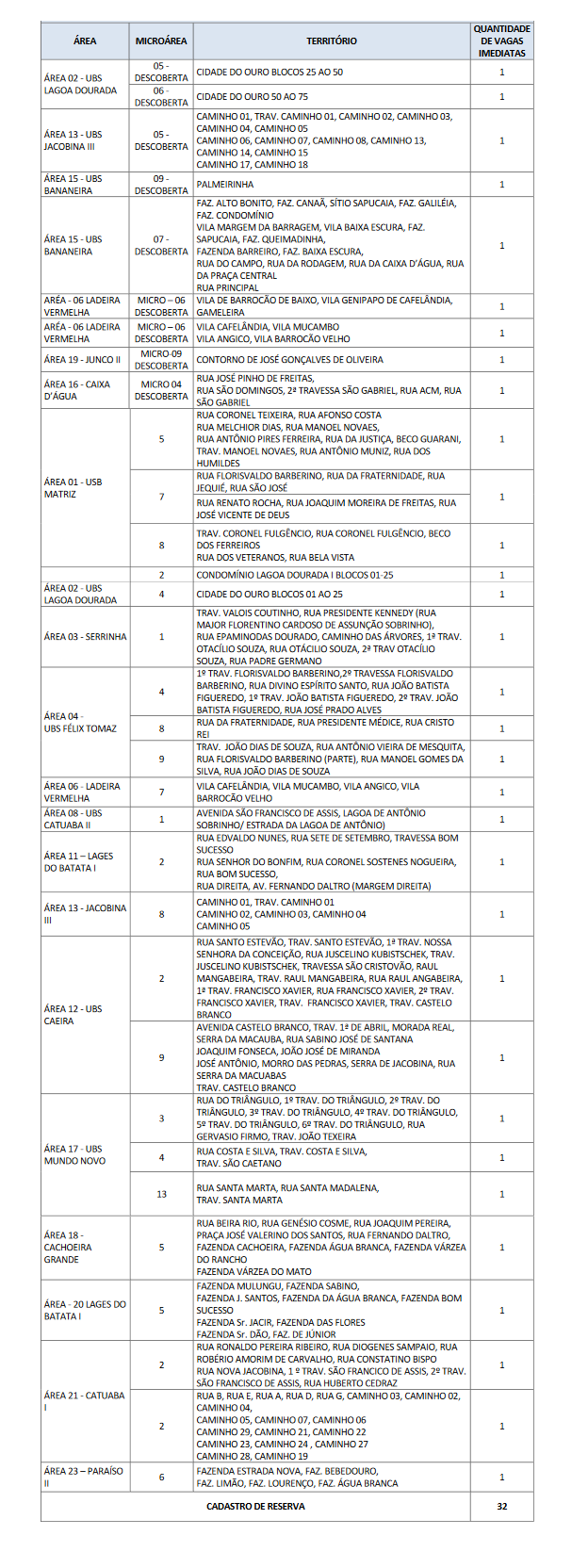 | Agente Comunitário de Saúde (diversas áreas) | 32 CR | R$ 2.640,00 |
