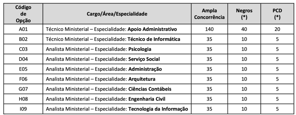 | Analista Ministerial – Especialidade: Tecnologia da Informação | 1 + CR | Nível Superior superior em Ciência da Computação ou Sistemas de Informação ou Tecnologia em Processamento de Dados ou outro curso com graduação plena em Informática | R$ 6.239,72 |