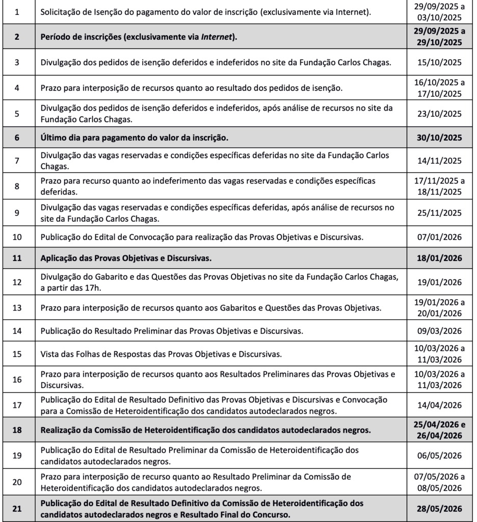 Os candidatos serão avaliados na data provável do dia 18 de janeiro de 2026. O edital está sob organização da banca FCC.