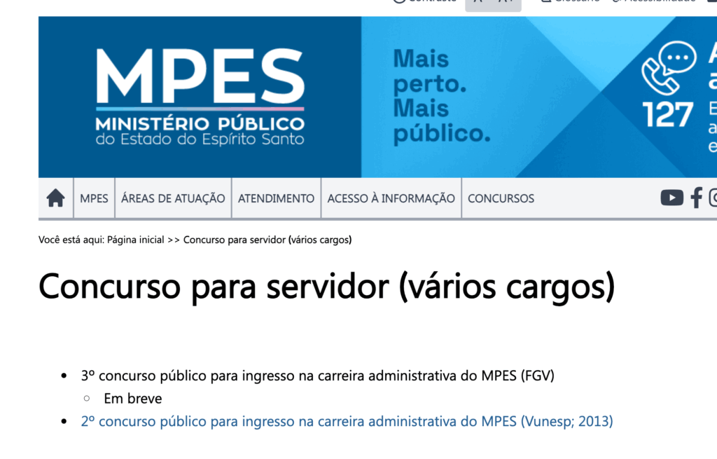 Confira abaixo a área do site do MP ES já reservada para receber o novo edital: