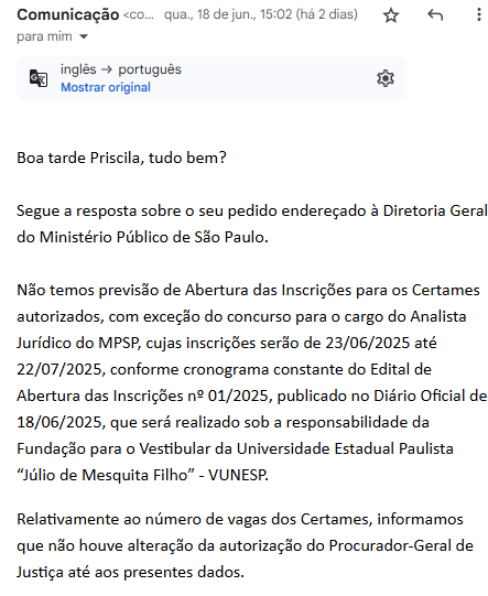 Também tivemos o cuidado de checar se os novos concursos públicos irão ofertar mais vagas do que as divulgadas inicialmente e a resposta foi que quanto “ao número de vagas dos Certames, informamos que não houve alteração da autorização do Procurador-Geral de Justiça até aos presentes dados”.
