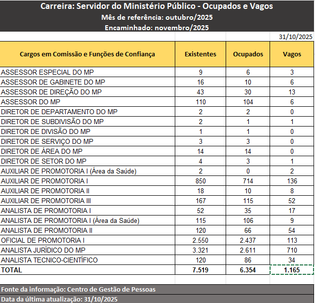 De acordo com o último levantamento disponibilizado pelo Portal de Transparência do MP SP, de outubro de 2025, são 1.165 cargos vagos. Veja o detalhamento: