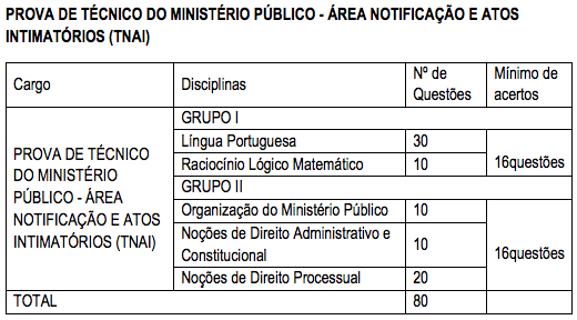 As tabelas a seguir resumem as disciplinas cobradas por cargo, com seus respectivos números de questões e mínimo de acertos: