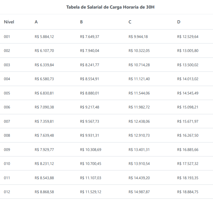 - R$ 5.884,12 (final da carreira: R$ 18.884,75) – 30 horas semanais