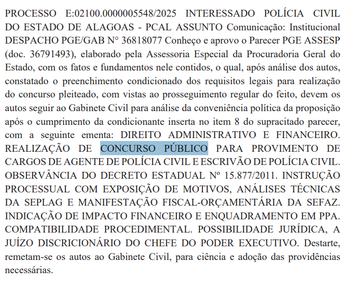 Importante destacar que o certame foi confirmado pelo governador Paulo Dantas. Ao anunciar que o estado de Alagoas promoverá o “maior concurso público da história”, o chefe do Executivo revelou que serão ofertadas 300 oportunidades para os cargos de Agente e Escrivão.