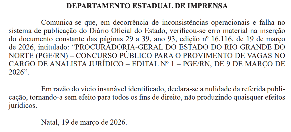 Foi publicada, no Diário Oficial do Rio Grande do Norte, nota sobre uma “falha na divulgação” do novo edital da Procuradoria-Geral do Estado do Rio Grande do Norte!