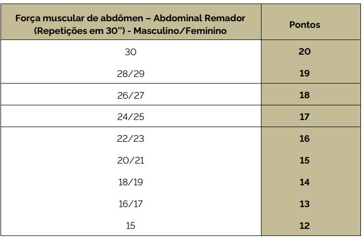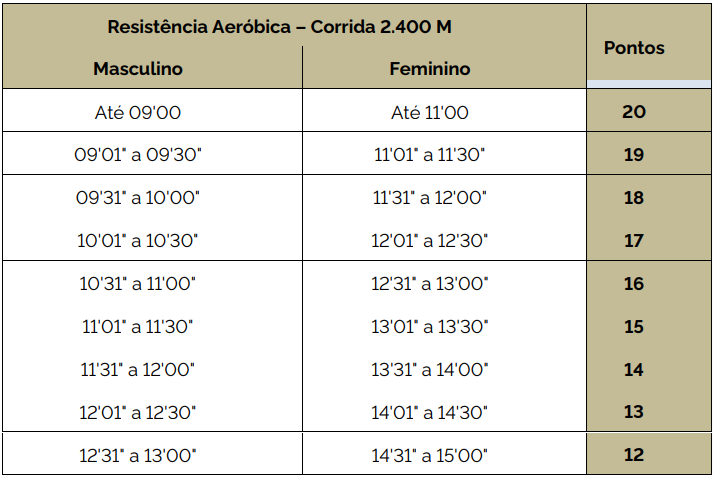 A Avaliação Física Militar terá caráter eliminatório e classificatório, devendo o candidato alcançar o mínimo de 60% de rendimento em cada modalidade (12 pontos) para aprovação, conforme tabelas a seguir, aplicáveis a todos os candidatos: