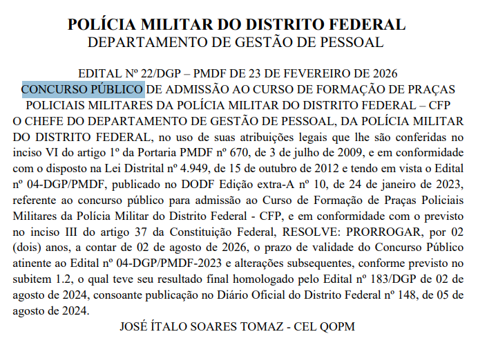 Além disso, a PMDF prorrogou por dois anos a validade do último concurso público para Praças Policiais Militares (CFP).