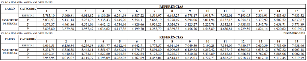 - Assistente de Perícia: Inicial: R$ 3.803,80 / Final: R$ 7.633,32