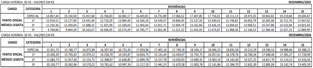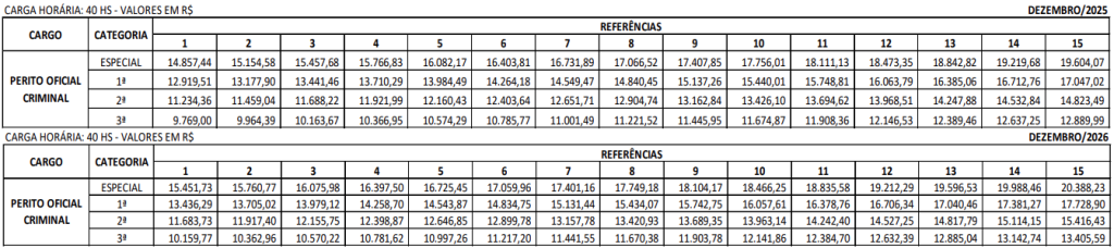 - Perito Oficial Criminal: Inicial: R$ 9.769,00 / Final: R$ 19.604,07
