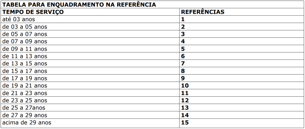 O avanço entre as referências abaixo relacionadas acontecerão por tempo de serviço.