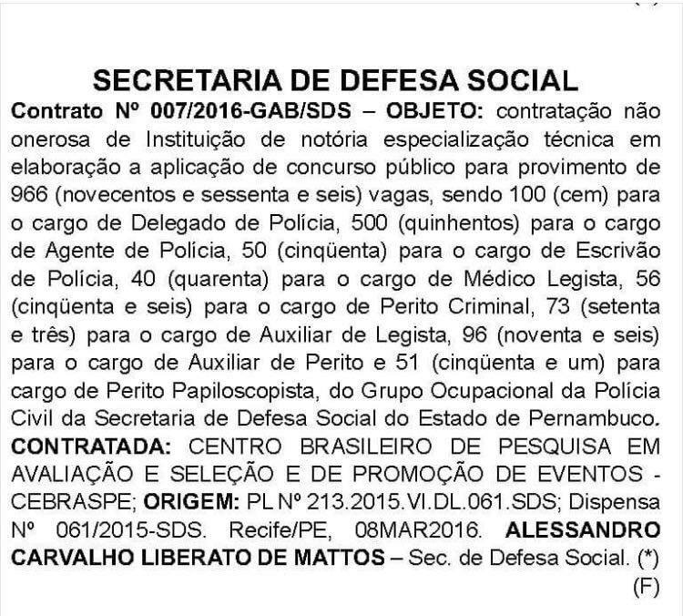 Foi divulgado na última terça-feira, 08, no Diário Oficial de Pernambuco, o documento que oficializa a contratação do Centro de Seleção e de Promoção de Eventos (CESPE) como organizador do próximo concurso da Polícia Civil do Estado de Pernambuco. Realizada a contração da banca, o edital pode ser divulgado a qualquer momento.