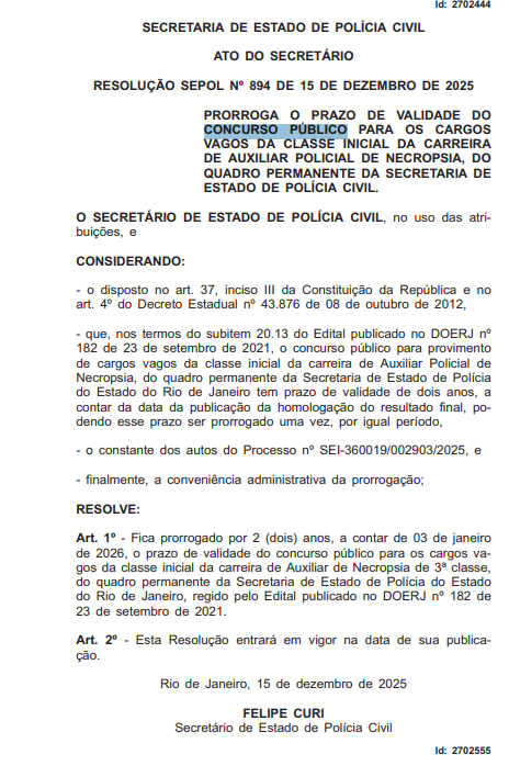 Após o governador Cláudio Castro anunciar que autorizou um novo concurso público da Polícia Civil do Rio de Janeiro, o aval foi divulgado no Diário Oficia. Veja na íntegra!