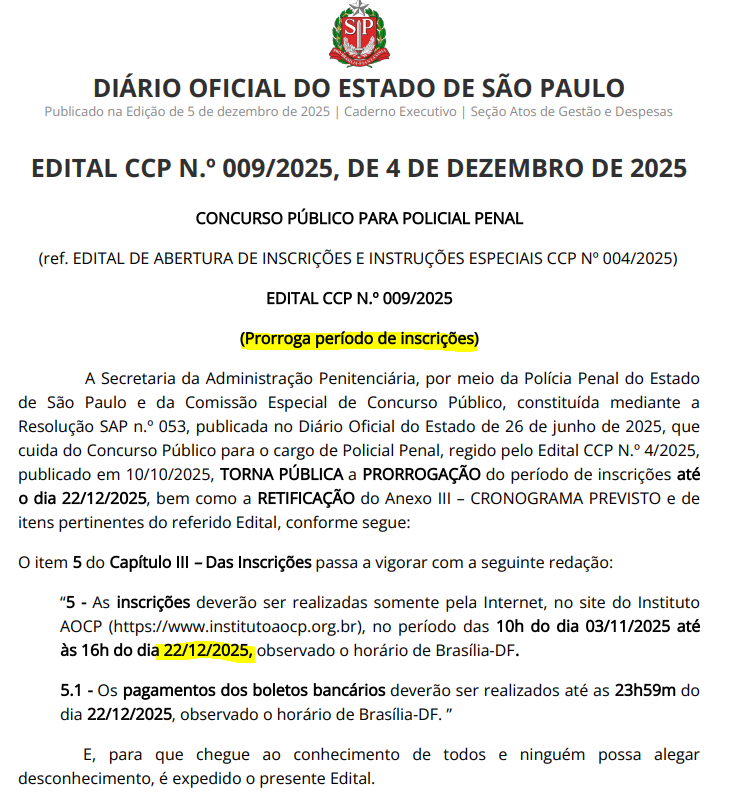 O último edital da Polícia Penal de São Paulo foi publicado em outubro de 2025, com 1.100 vagas para o cargo de Policial Penal e salário inicial de R$ 4.695,60. Os principais requisitos para participar do certame são: possuir diploma de graduação de nível superior; ter até 35 anos; ter a estatura mínima de 1,60m; e ter CNH categoria “B”. A prova objetiva será aplicada em 08 de fevereiro de 2026.