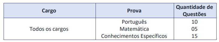 Ela será composta de questões de múltipla escolha, com 05 alternativas cada uma, e será elaborada de acordo com o conteúdo programático, conforme quadro abaixo: