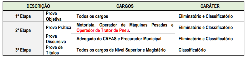 Retificação 1 – 21/10 altera Escolaridade e carga horária de cargos; EXCLUI a exigência da Carteira Nacional de Habilitação como requisito de cargos específicos; altera item de atribuições e INCLUI Operador de Trator de Pneu na Prova PRÁTICA.