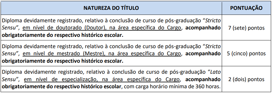 A pontuação máxima dos Títulos será de 7 (sete) pontos, exclusivamente para os candidatos aprovados nas fases anteriores.