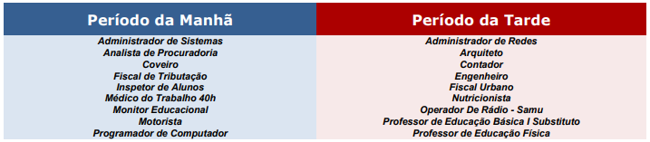 Vale ressaltar que elas serão aplicadas em dois turnos (manhã e tarde), divididas por cargos assim como mostra a tabela: