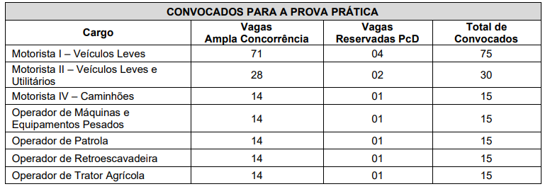 A aplicação será somente para os candidatos aos cargos de Motorista I – Veículos Leves; Motorista II – Veículos Leves e Utilitários; Motorista IV – Caminhões; Operador de Máquinas e Equipamentos Pesados; Operador de Patrola; Operador de Retroescavadeira; e Operador de Trator Agrícola, que forem aprovados na Prova Objetiva, conforme tabela: