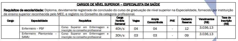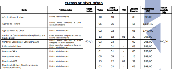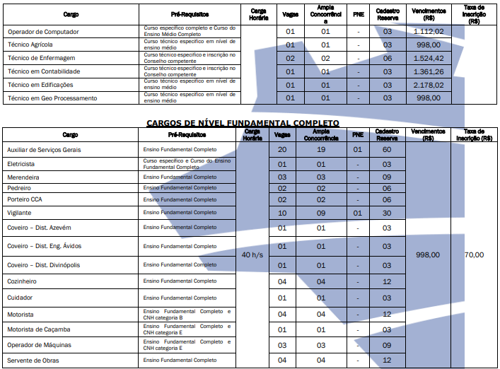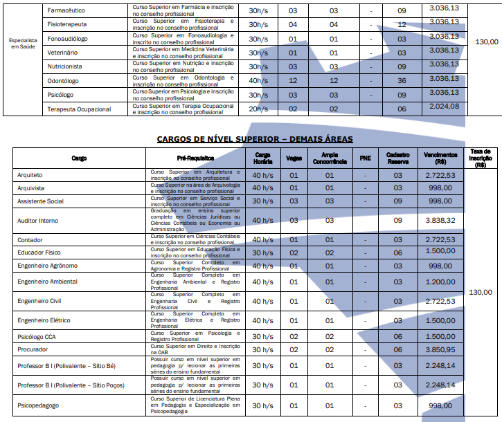 Segundo o documento, estão previstas vagas para os níveis fundamental, médio e superior de escolaridade, porém especificações como quantidade de vagas, funções e salários ainda não foram publicadas.