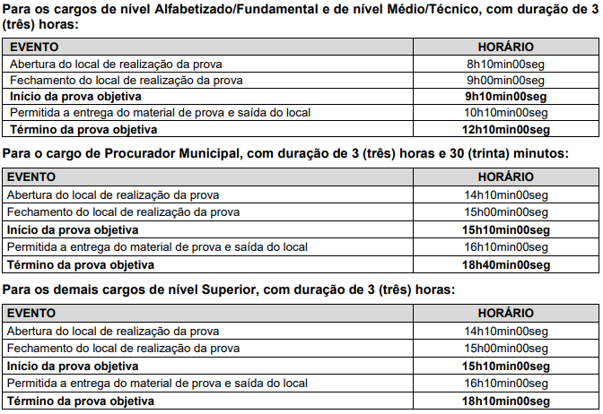 A duração da prova foi de 3 horas a 3 horas e 30 minutos, conforme o cargo: