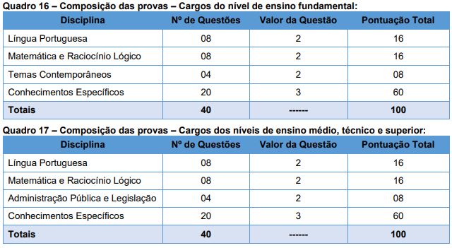 A prova objetiva será constituída de 40 questões, distribuídas conforme os quadros abaixo: