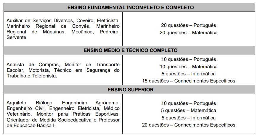 - Prova Prática, de caráter eliminatório, para os cargos de Coveiro, Eletricista, Mecânico, Motorista e Pedreiro; e