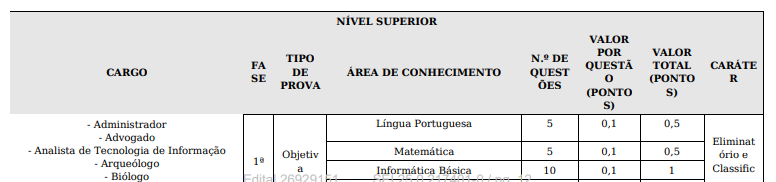 - Nível Superior: Serão 50 questões, distribuídas entre Língua Portuguesa, Matemática, Informática Básica, Políticas e Legislações Públicas e Conhecimentos Específicos. As regras de aprovação são as mesmas dos outros níveis, com a necessidade de obter no mínimo 60% dos pontos e não zerar em nenhuma área de conhecimento.