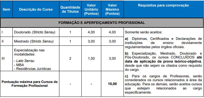 Cada título será considerado e avaliado uma única vez. Vale ressaltar que os requisitos citados para ingresso ao cargo citados no não serão pontuados, considerando que a avaliação do enquadramento dos requisitos para admissão/posse ocorrerá somente no ato de nomeação/convocação.