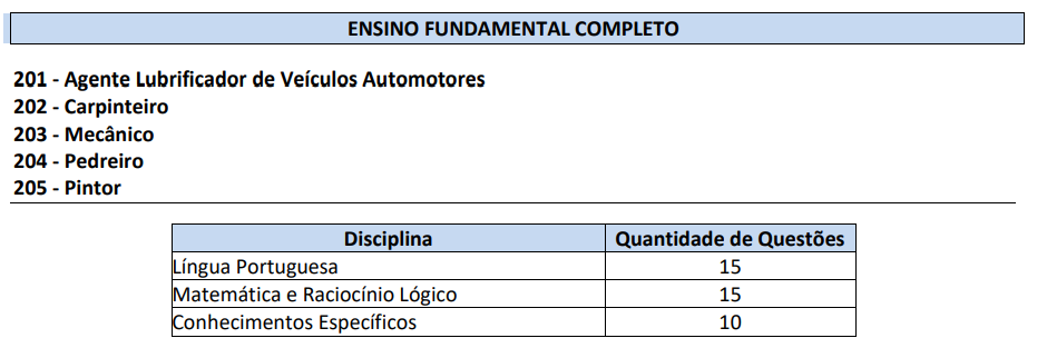 - Prova prática para 201 – Agente Lubrificador de Veículos Automotores, 202 – Carpinteiro, 203 – Mecânico, 204 – Pedreiro, 205 – Pintor, 301 – Agente Administrativo, 313 – Orientador Social e 501 – Coordenador de Serviços de Referência Socia, de caráter eliminatório.