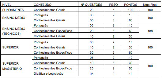 - 1ª ETAPA – PROVA OBJETIVA: (COMUM A TODOS OS CARGOS) – a prova teve caráter classificatório e eliminatório, sendo considerados CLASSIFICADOS/HABILITADOS nesta etapa, os candidatos que atingiram nota final igual ou superior a 50% (cinquenta por cento) de acertos apurado no total da prova, até 4 (quatro) vezes o número de vagas por cargo.