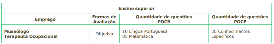 - Museólogo: Ensino superior completo em Museologia ou História da Arte com ênfase em Museologia e registro ativo e regular no COREM; mestrado ou doutorado completo em Museologia, por cursos ou escolas devidamente reconhecidos pelo Ministério da Educação e Cultura e registro no COREM; ou ensino superior completo, que contenha pelo menos 5 (cinco) anos de exercício de atividades técnicas de Museologia, devidamente comprovados.