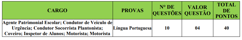 Para TODOS OS CARGOS será considerado o candidato classificado com nota igual ou superior a 50 (cinquenta pontos). Confira abaixo os detalhes desta etapa: