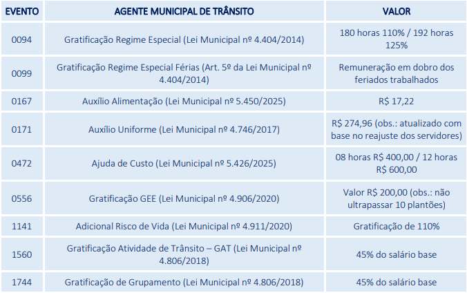 A remuneração do cargo de Agente Municipal de Trânsito é de R$ 1.518,00 (30h semanais), acrescida dos benefícios adicionais, tais como gratificações, auxílios, adicionais e ajudas, conforme descrito a seguir: