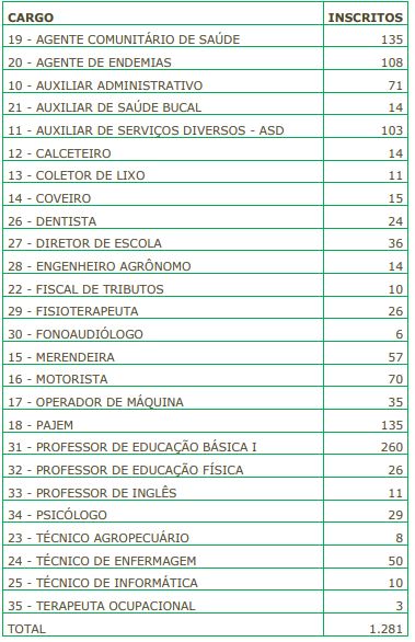 No total, foram registrados 1.281 inscritos, sendo que o cargo com maior procura foi o de Professor de Educação Básica I: