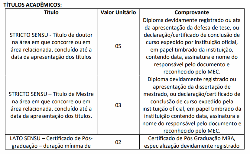 - Prova de títulos somente para cargos previamente selecionados (classificatório); e