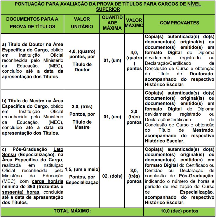 A pontuação da documentação da Prova de Títulos se limitará ao valor máximo de 10 pontos.