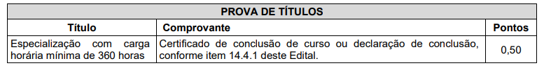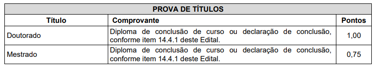 A prova de títulos será avaliada na escala de 0 (zero) a 1,00 (um) ponto. A pontuação não é cumulativa, portanto, será considerado apenas 1 (um) título por candidato. Caso seja apresentado mais de um título, será pontuado exclusivamente aquele que tiver a maior pontuação, conforme TABELA: