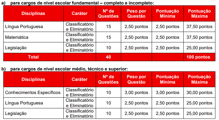 • Prova objetiva para todos os cargos (eliminatório e classificatório)