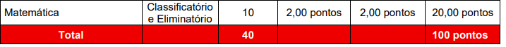 As provas objetivas foram avaliadas em 100 pontos, correspondendo ao total de 40 questões de múltipla escolha. Cada questão de múltipla escolha teve 05 (cinco) alternativas de respostas (A, B, C, D ou E), mas apenas uma resposta correta.