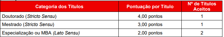 As provas de títulos, de formação acadêmica de pós-graduação, têm caráter classificatório, exclusivamente, para cargos públicos de nível escolar superior, com pontuação máxima de 10 pontos.