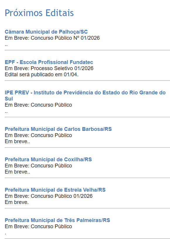 A FUNDATEC será a empresa responsável por todas as etapas do certame e já consta com o município em PRÓXIMOS CONCURSOS em sua página: