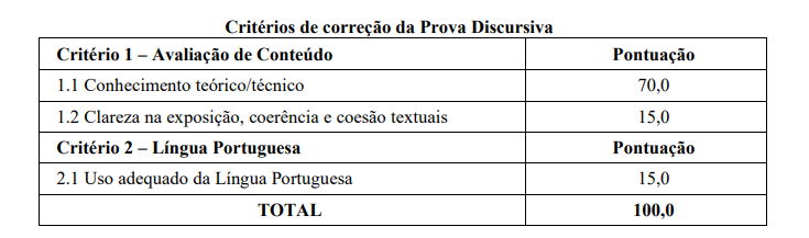 A etapa terá a pontuação de 100 e será reprovado do certame o candidato que não obtiver o mínimo de 50 pontos.