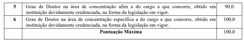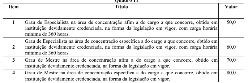 A prova de títulos representa a 3ª (terceira) etapa do concurso para todos os cargos de Professor, de caráter classificatório, valendo 100,0 pontos.