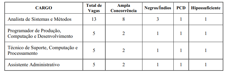 Deste total, 5 vagas serão destinadas ao cargo de Programador de Produção, Computação, 5 para Técnico de Suporte e outras 5 vagas para Assistente Administrativo, todos de nível médio.