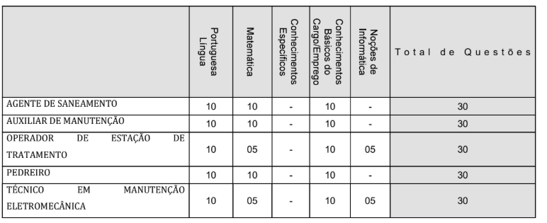 • Prova prática, de caráter eliminatório e classificatório, para AGENTE DE SANEAMENTO, AUXILIAR DE MANUTENÇÃO, OPERADOR DE ESTAÇÃO DE TRATAMENTO, PEDREIRO e TÉCNICO EM MANUTENÇÃO ELETROMECÂNICA.