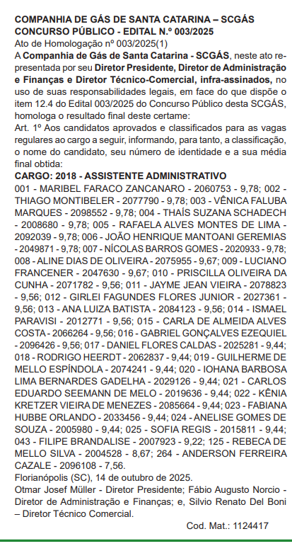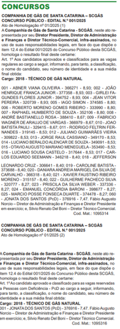 Anteriormente, a SC Gás também já havia publicado outro edital (nº 1) com 1 (uma) vaga para Técnico de Gás. Para este, o resultado final já foi homologado, passando a contar os dois anos de validade, até 9 de julho de 2027.